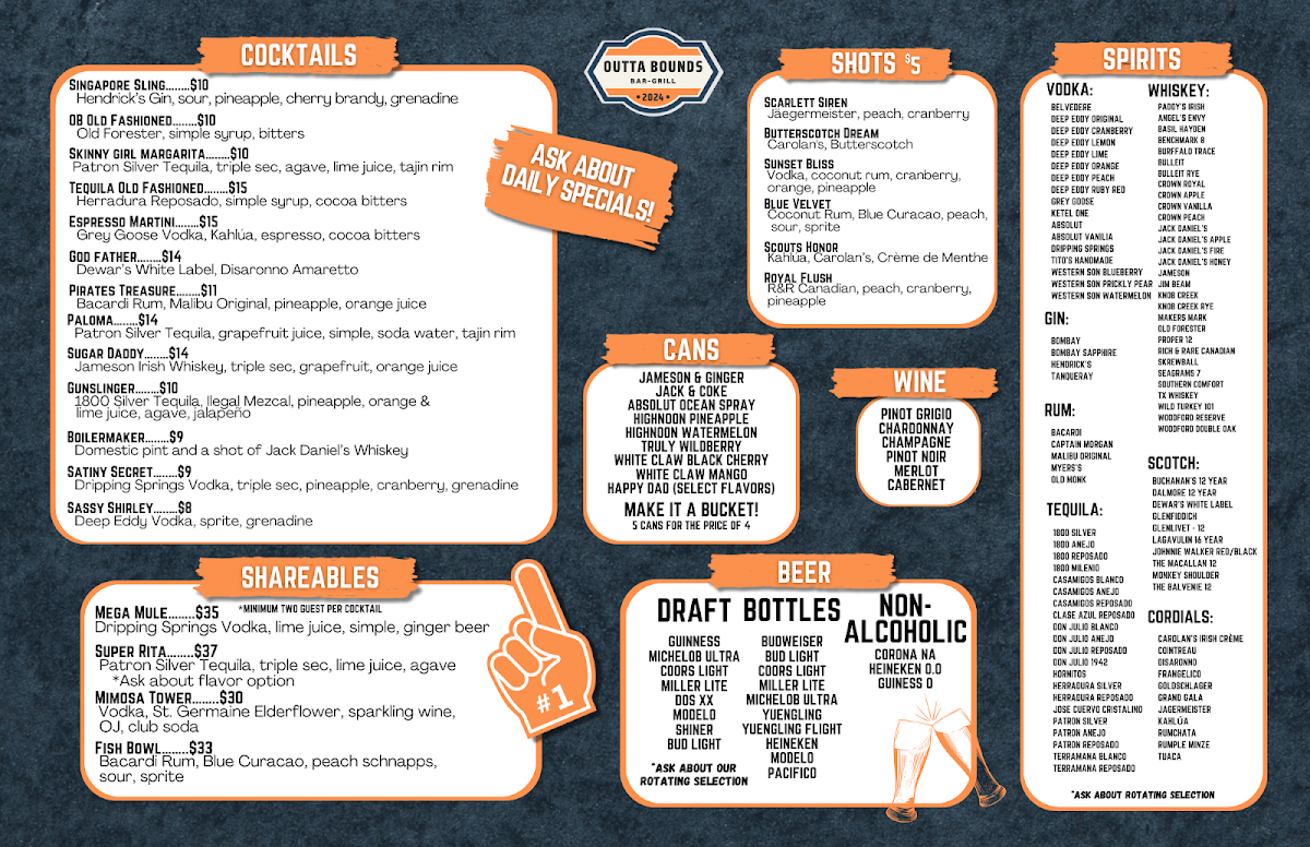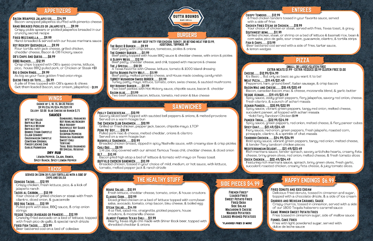 Introducing the menu at Outta Bounds Bar & Grill: Nestled in Little Elm, Texas, Outta Bounds Bar & Grill offers a diverse menu that celebrates both comfort food and healthier options, ensuring every guest finds something to love. The menu shines with delightful appetizers like crispy churros served with habanero caramel sauce, decadent fried donuts topped with chocolate, and funnel cake fries drizzled with dulce de leche. For those craving something nutritious, the classic Cobb salad and steak salad provide fresh and flavorful alternatives.